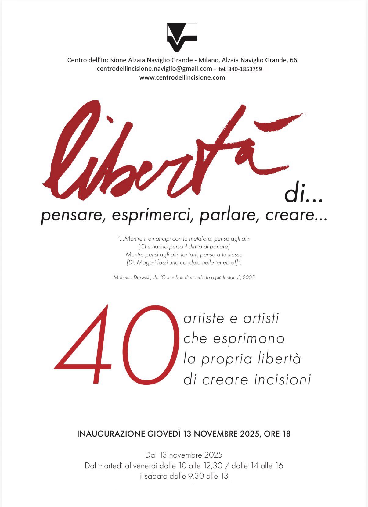 Il Centro dell'Incisione Alzaia Naviglio Grande presenta una grande mostra collettiva dedicata al tema della libertà: libertà di pensare, di parlare, di creare, di esprimersi. Un progetto che riunisce più di 40 artiste e artisti incisori, chiamati a raccontare attraverso le proprie opere un atto creativo indipendente, personale e necessario.